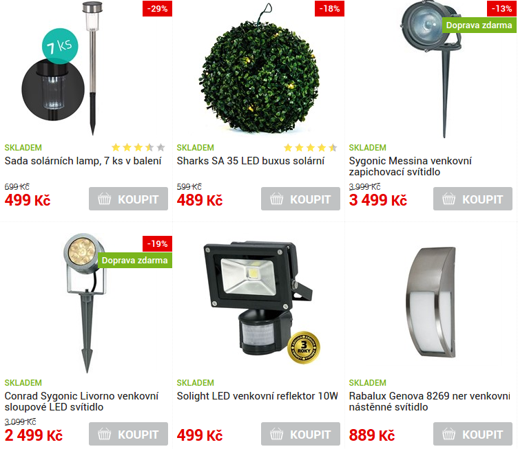 Conrad SLV Myra venkovní sloupové svítidloConrad Sygonic Livorno venkovní sloupové LED svítidloFIERA N nástěnné zahradní LED svítidloGARD LED 36 zahradní svítidloLED lampa Bulb fialováLED lampa Bulb modráPARK N zahradní nástěnné svítidloRabalux Genova 8269 ner venkovní nástěnné svítidloSada solárních lampSharks SA 35 LED buxus solárníSolární lampa kónická plastováSolární LED svítidlo s detektorem pohybuSolární plovoucí světlo BallSolight LED venkovní reflektorSygonic Messina venkovní zapichovací svítidloVANA S venkovní reflektorové svítidlo se senzorem