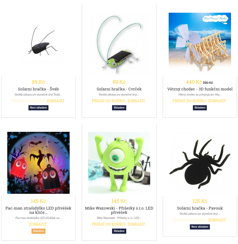 Albus Brumbál kouzelnická hůlkaAndroid LED přívěšek na klíčeHarry Potter kouzelnická hůlkaHermiona Grangerová kouzelnická hůlkaLetadélko GeekWorldLetadlo GeekWorldLord Voldemort kouzelnická hůlkaMike Wazowski LED přívěšekPac-man řívěšek na klíče se zvukemPac-man strašidýlko LED přívěšekPříšerky s.r.o. LED přívěšekRC Letadlo StartRC mini tank Tiger se zvukySolární hračka CvrčekSolární hračka PavoukSolární hračka ŠvábVětrný 3D funkční modelVětrný chodec