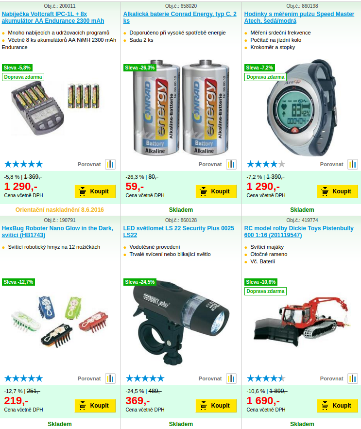 Akumulátorová LED svítilna VoltcraftAlkalická baterieAlkalická baterie Conrad EnergyDekorační Světelná hadiceHexBug Roboter NanoHexBug Roboter Nano Glow in the DarkHodinky Beurer PM 25hodinky s měřením pulzuHodinky Speed Master AtechKlip na 9 V bateriiKompaktní mobilní nabíječkaKompaktní světlometLED čelovkaLED světlometLED světlomet LS 22 Security PlusLED svítilna s nouzovým nabíjenímmobilní akumulátorMobilní akumulátor Powerbank LogiLinkNabíječka bateriíNabíječka Voltcraft BC-500Nabíječka Voltcraft IPC-1LNáplň do výrobníku mlhyrc model rolbyRC model rolby Dickie Toys PistenbullySada palivových článků Horizon Power-SetSada palivových článků na vodíkSolární bezdrátový cyklocomputerStropní reproduktorSvětelná hadice Pen Light Mc CryptUltrazvukový plašič koček Cats-Do-RightUltrazvukový trenér koček Cats-Do-RightVestavný reproduktor Speaka