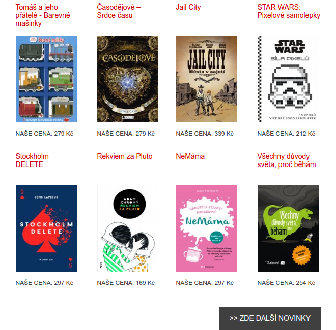 7 návyků spokojené rodiny knihaBáječné dny knihaBlázinec v Silicon Valley knihaČasodějové Srdce času knihaJail City knihaJak se loví hlupáci knihaNeMáma knihaRekviem za Pluto knihaStačí jen chtít knihaSTAR WARS Pixelové samolepkyStockholm DELETE knihaTomáš a jeho přátelé Barevné mašinkyUmění riskovat knihaVelká kniha tmyVšechny důvody světa proč běhám kniha